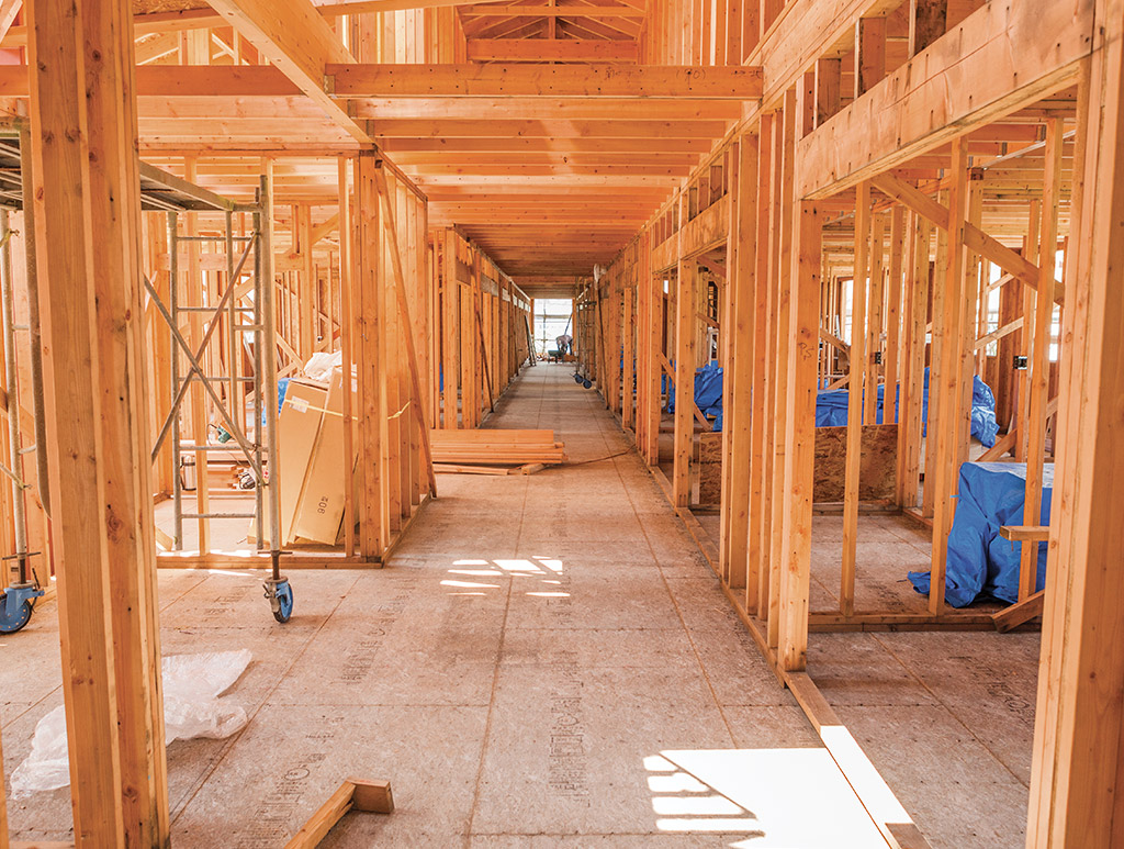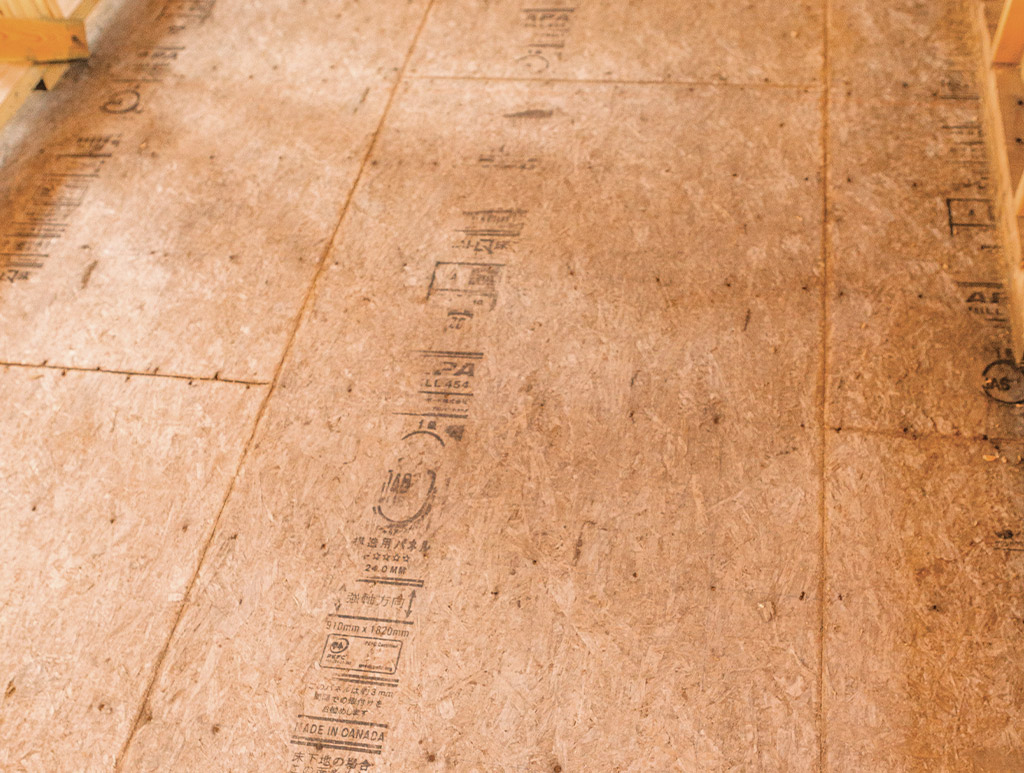合板に代わる床材として最適なOSB「This Side Up」と表記された面が表になるよう設置してくださいウエストフレイザー.6 T&Gを設置する際は、短手方向のジョイント部に隙間を確保してください